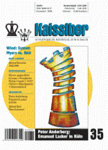 Auch in Kaissiber 35 stand Emanuel Lasker im Mittelpunkt. Peter Anderberg schildert in seinem 18 Seiten langen Beitrag „Emanuel Lasker in Köln“ zwei Aufenthalte Laskers in der Domstadt, in den Jahren 1908 und 1925. Neben Partien, die bisher in keiner Lasker-Kompilation enthalten sind, ist auch sonst Unbekanntes über Lasker zu erfahren, zum Beispiel findet man Laskers Artikel von 1925 über seine Thyrower Eröffnung 1. e4 e5 2. Sa3. Lew Gutman setzt seine im vorigen Heft begonnene Analyse der Canal-Variante im Zweispringerspiel fort: 1. e4 e5 2.Sf3 Sc6 3. Lc4 Sf6 4. d4 exd4 5. 0-0 Sxe4 6. Te1 d5 7.Sc3!?. Maurits Wind untersucht, ob sich das Konzept von Hugh Myers (vgl. Heft 34) auch gegen die Réti-Eröffnung mit Erfolg anwenden lässt: 1. Sf3 h6 sowie verzögerte Fassungen eines Aufbaus mit g7-g5 schneiden erstaunlich gut ab. Beide Beiträge zur Myers-Konzeption, aus Heft 34 und 35, lassen sich gut in einem Repertoire vereinen. Klaus Kögler erläutert eine eigene Partie mit dem Mittelgambit, und Bent Larsen erinnert an den 2009 verstorbenen Héctor Rossetto.